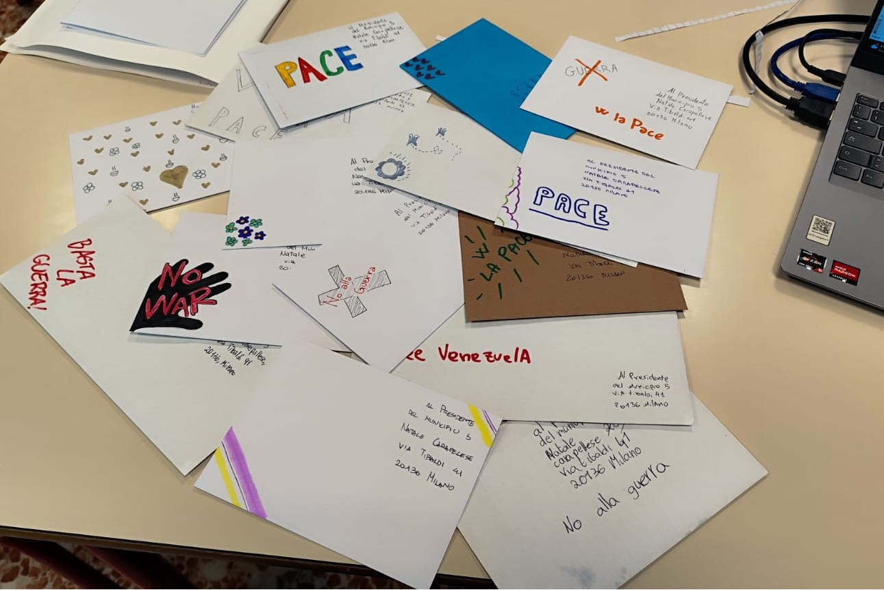 Per questo, molti studenti del IC di Via Palmieri hanno aderito all’iniziativa “Lettere di pace”, lanciata dai docenti del MCE (Movimento di cooperazione educativa) e hanno mandato le loro lettere, cartacee e affrancate, concrete e colorate, a “chi può” fare qualcosa per promuovere la pace: ad amministratori locali, politici, capi di governo, perfino al papa. Bambine e bambini, ragazze e ragazzi hanno fatto sentire la loro voce, hanno espresso la loro opinione, hanno posto domande, hanno avanzato proposte, con semplicità e chiarezza.