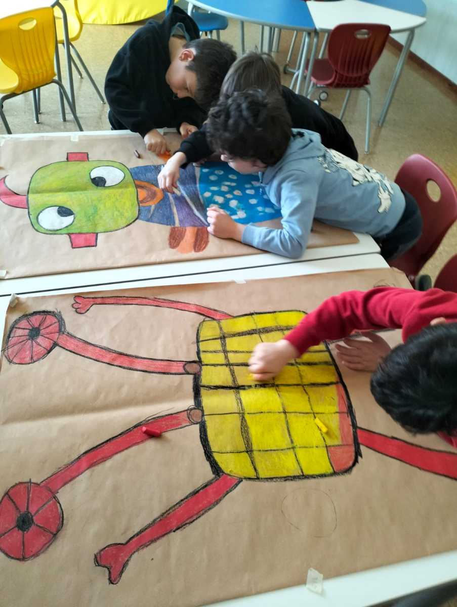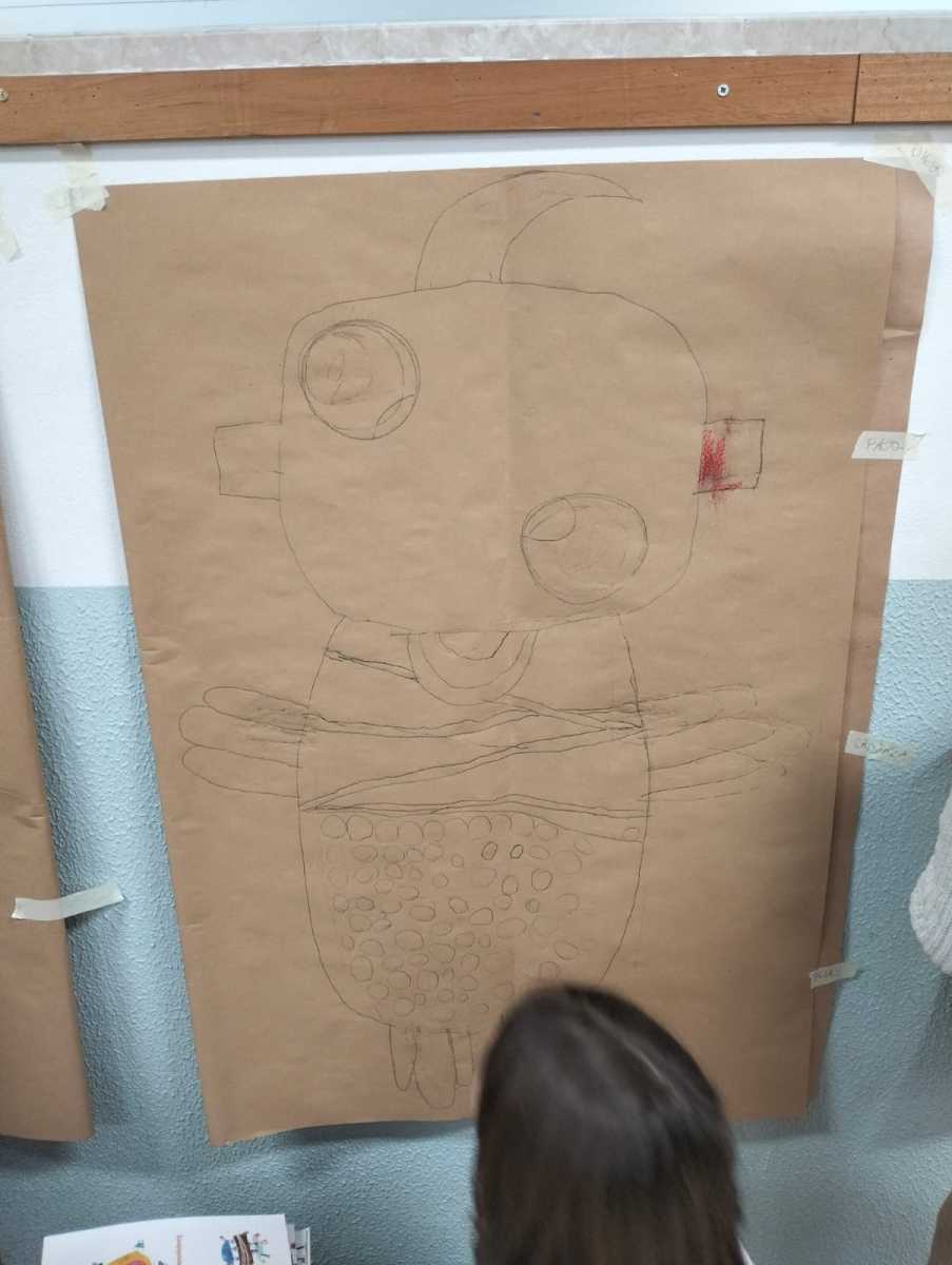 Prima di trasferire il disegno su foglio 50x70cm, bambine/i hanno riflettuto, in una collaborazione tra pari, sul loro bozzetto, valutando cosa funzionava e cosa no, e pianificando come migliorare il risultato finale, con un’esplorazione pratica del concetto di misura (quanto deve essere grande? come misurarlo? …)!